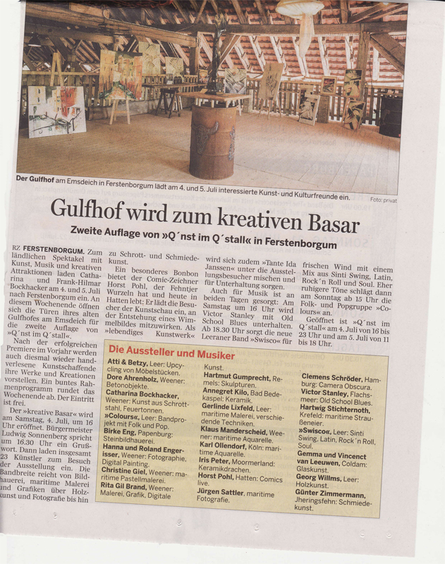 Ja, wir freuen uns sehr auf unsere Kunstausstellung "Q'nst im Q'stall", am 4. und 5. Juli (siehe "Kalender"), bei Catharina und Hilmar Bockhacker in Ferstenborgum!